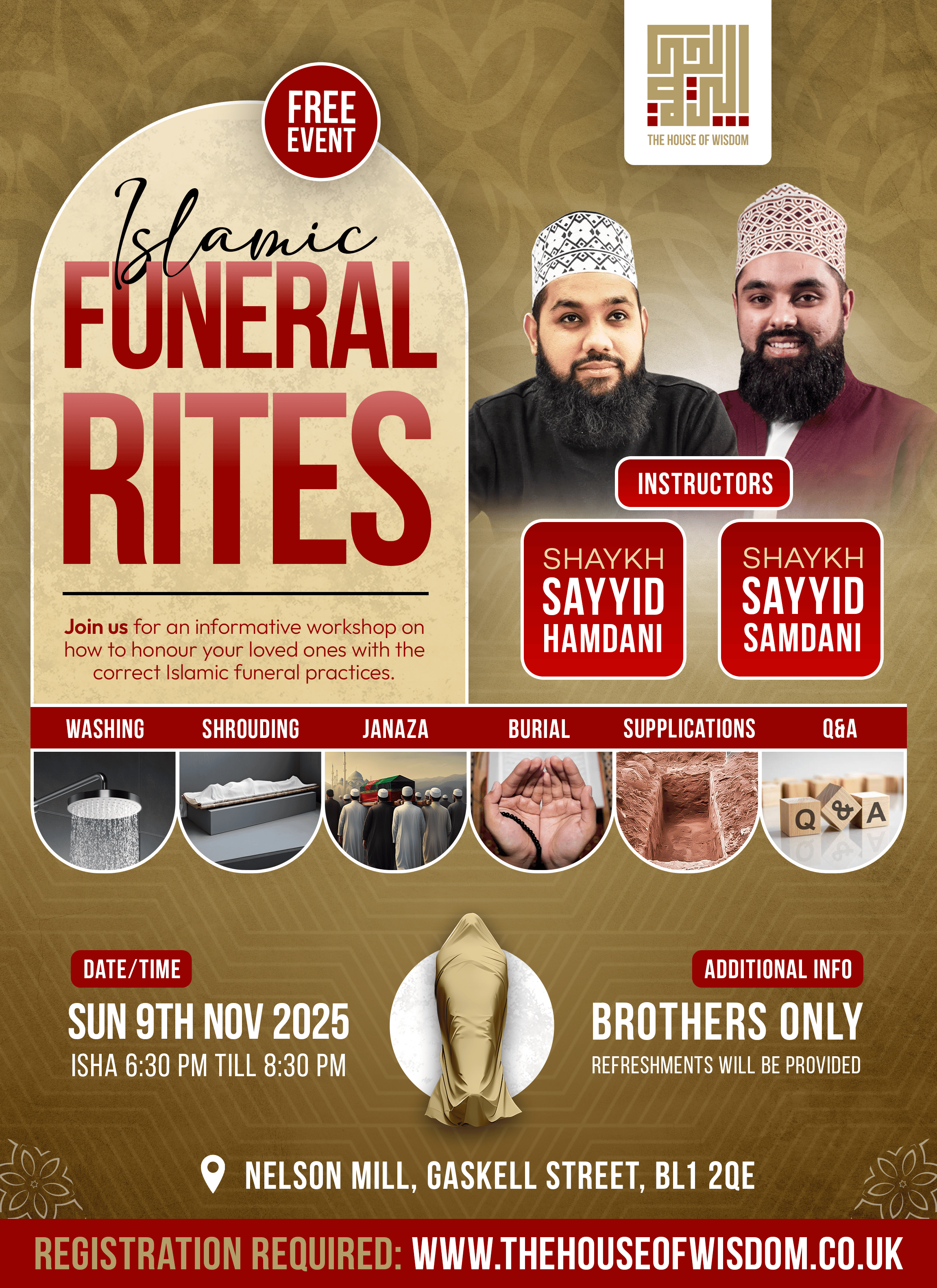 Islamic Funeral Rites Sunday 9 November 2025 18:30 19:30 Sadr Ul Ulama Academy Gaskell Street Bolton, England, BL1 2QE United Kingdom (map) Google Calendar ICS Join us at the House of Wisdom for an informative workshop on how to honour your loved ones with the correct Islamic funeral practices. Learn more
